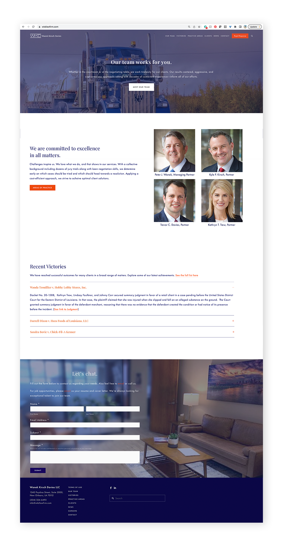 Located in New Orleans, WKD needed a brand refresh and more importantly - a website, to accommodate the law firm’s fast-growing team. Various customized search fields were implemented to ensure smooth and easy navigation for the user. Visit the live website here.